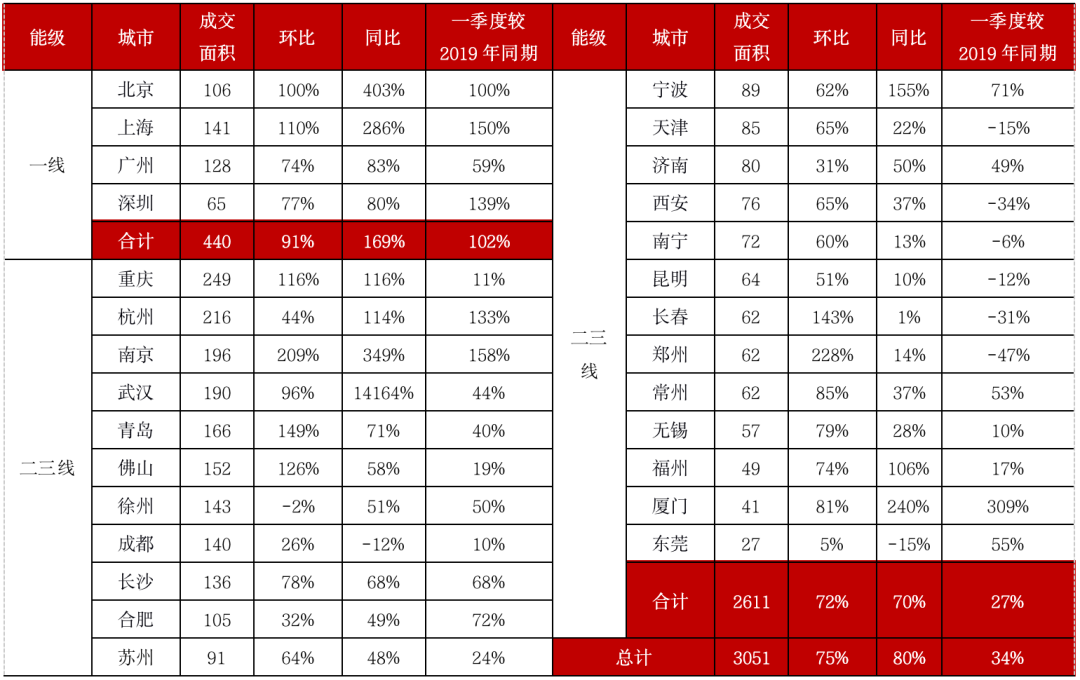 3月,28个典型城市商品住宅成预计成交规模将达3051万平方米,同、环比分别增80%和75%。整体而言,一季度较2019年同期增长34%,一线城市继续领涨,二三线城市分化特点逐渐体现。