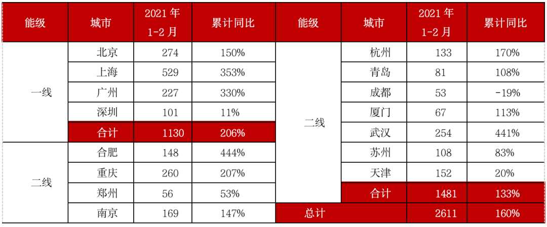 一线城市成交面积上扬显著,同比涨幅高达206%。上海和广州最为亮眼,1-2月成交量分别为529万平方米和227万平方米,同比上涨均超过300%;北京其次,累计同比增速也高达150%;仅深圳市场增幅11%较为稳定,其原因在于前期增长较快已升至高位,市场调控日益趋严。