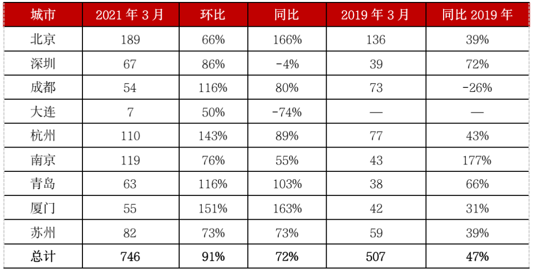 整体来看,3月全国9个重点城市二手房成交体量为746万平方米,同比增长91%,环比增长72%。对比2019年同期,成交总量同比增长47%,其中南京同比涨幅高达177%,深圳、青岛等也有6成以上涨幅。