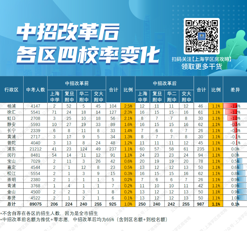 第二类是区属市重点较多的所在的区,比如黄浦、静安、闵行、浦东,原因是区属市重点,大幅减少了自招(全市招生),增加了名额到校,因为名额到校只到本区,所以最大得益者还是这些市重点多的区。具体来说是这些区菜中里的头部学生。