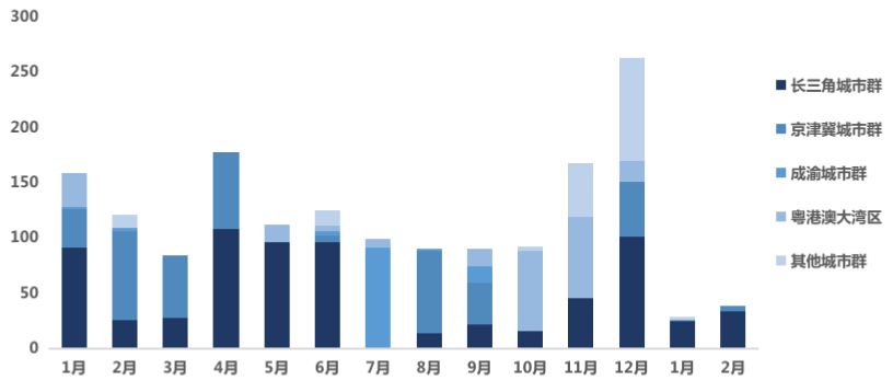 内地大宗成交物业城市群分布(成交金额,2020.01-2021.02)