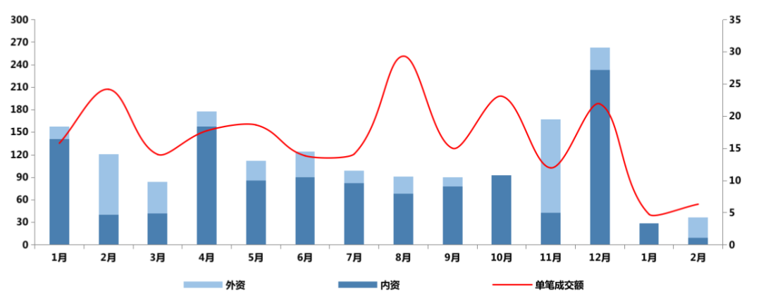 克而瑞CAIC AI监测显示,2021年1-2月,中国内地大宗物业共成交12笔,交易总额约 67亿元,同比降幅76.3%;平均单笔成交额约5.6亿元,同比下降69.9%,降幅显著。