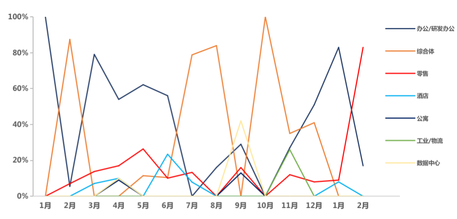 一线城市新兴商务区的优质写字楼以及运营表现优异、回报稳定的商业资产受到资本青睐。1月,办公/研发办公业态成交占比超80%,为绝对主力;2月,受上海商业成交占比提升影响,一线城市整体商业占比大幅提升,为近一年来最高值。