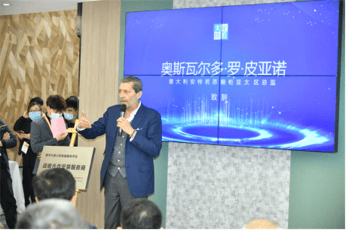 意大利安特若思橱柜亚太总监奥斯瓦尔多.罗.皮亚诺先生致辞,非常感谢受邀发布会,中国的发展潜力巨大,安装是产品完成整体的重要一环,安特若思橱柜将与大圣小匠分享好的经验,助力安装服务平台的发展。