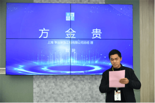 上海亨远装饰工程有限公司方金贵先生致辞,从行业这样一句话“三分地板、七分安装”开始阐述安装环节的重要性,只有通过规范化、标准化、流程化的施工,才能保证装出满意的效果。我们也会紧密的和大圣小匠继续开展合作,搭上新的发展高速列车,打造行业优质的施工服务团队,为家居建材行业的发展添砖加瓦,为客户筑起快乐的家居生活,为我们的安装技师提供发展平台,让蓝领技师弘扬工匠精神创造人生价值!