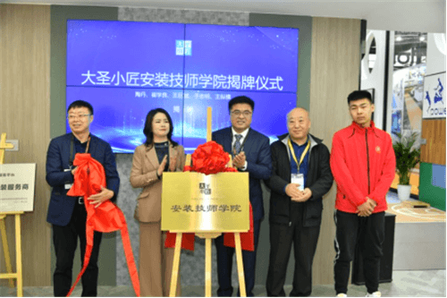 11点,大圣小匠安装技师学院揭牌仪式开始,由中国建筑装饰协会建材家居分会秘书长陶丹女士,大圣小匠安装服务平台总经理崔学良先生,辽宁生态职业学院副校长王巨斌先生,北京林业大学材料科学与工程学院院长于志明先生,第一届全国技能大赛世界组木工项目冠军王纵横先生,上台共同见证揭牌仪式。