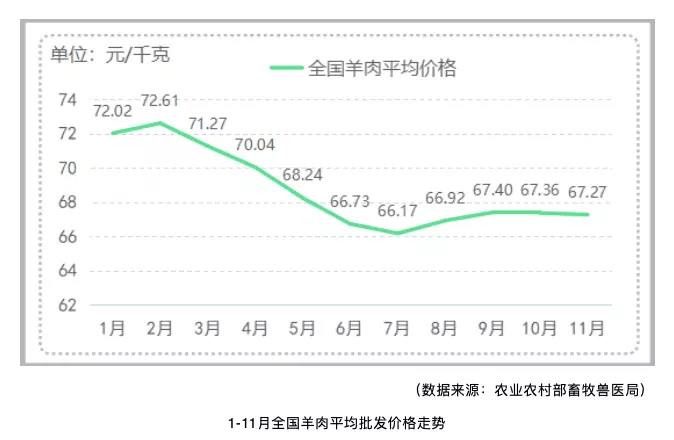 自2021年下半年以来,羊价呈现下行趋势,2022年11月,农业农村部畜牧兽医局公布的全国羊肉平均价格只有67.27元,与往日超过80元/公斤的“羊贵妃”早已不能同日而语。