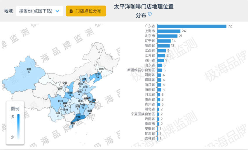 品牌整体布局以一线和新一线城市为主,太平洋咖啡在广东省有72家门店,上海市24家,北京市21家,辽宁省14家,陕西省13家,其他省份的门店数量仅为个位数,影响力有限。