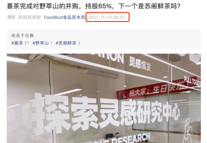 在2021年年底的时候,喜茶收购了野萃山,当时FoodBud就有猜测下一个会不会是苏阁鲜茶。