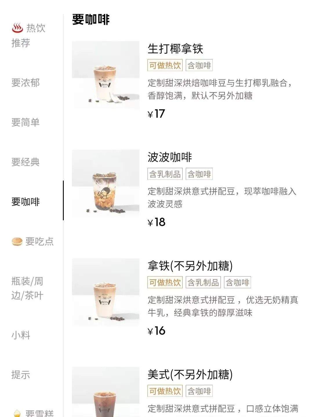 比如,瑞幸海盐芝士厚乳拿铁的原料有原味调味糖浆、海盐芝士奶盖风味固体饮料、稀奶油、厚牛乳、牛奶、浓缩咖啡等;挪瓦咖啡0卡糖白桃轻乳拿铁的原料有白桃、轻乳牛奶、浓缩咖啡等。