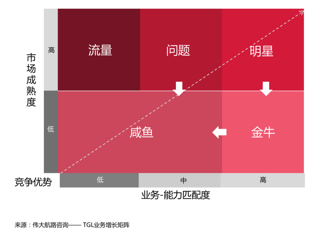 流量是指市场成熟度高,但能力匹配度较低的业务;问题是指市场成熟度高,但能力已经不够匹配的业务,比如汽车行业中的燃油车,电动车已经是大趋势,并且成熟度已经越来越高,传统车企如果去研发电动车则有可能会成为问题业务,因为其能力匹配度并没有完全吻合;