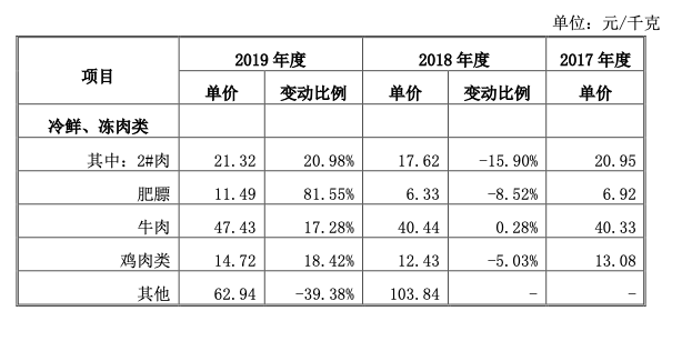 同时间段内,肉的单价由2018年的17.62元增加到2019年的21.32元。这意味着,巴比食品的采购会受到物价周期性浮动影响。