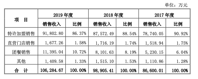 2017年至2019年,团餐销售收入分别为5230.15万、8101.63万、1.14亿,占总收入比重分别为6.04%、8.19%、10.72%。