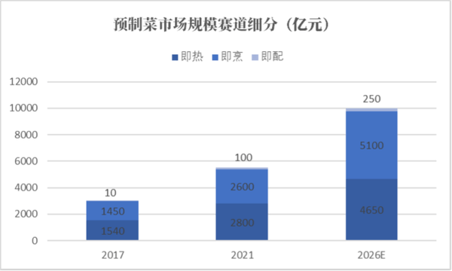 据德勤报告显示,2021年中国预制菜市场规模约为5500亿元,未来5年CAGR有望达13%,即热、即烹、即配的市场份额分别为2%、47%和51%;尽管当前即热赛道的市场份额最大,但即配与即烹赛道具备较大增长潜力,21至26年两大赛道CAGR分别达到20%和14%,远高于即热赛道。