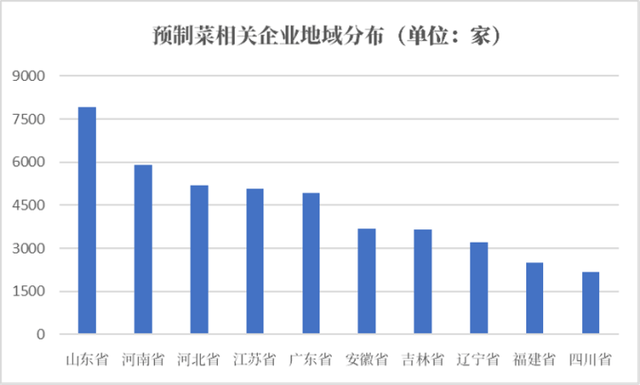 根据天眼查数据显示,截至目前,预制菜相关企业6.4万余家,其中,2022年1月-11月新增注册企业1,690余家,1-11月新增企业注册增速达42.7%;从地域分布来看,山东、河南以及河北,三地相关企业数量位居前列,分别拥有7,900余家、5,800余家以及5,100余家。