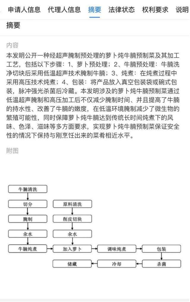 此外,专利数量是衡量一个赛道兴衰的标识。据天眼查数据显示,预制菜相关专利申请近3年处于高速增长态势。截止到2022年12月,预制菜相关专利申请已有55项,同比上升266.67%。其中,专利申请主要涉及加工、包装工艺,诸如:“一种经超声腌制预处理的萝卜炖牛腩预制菜及其加工工艺”,“一种罐装甲鱼预制菜的制备方法及设备”等菜肴制作工艺的专利。