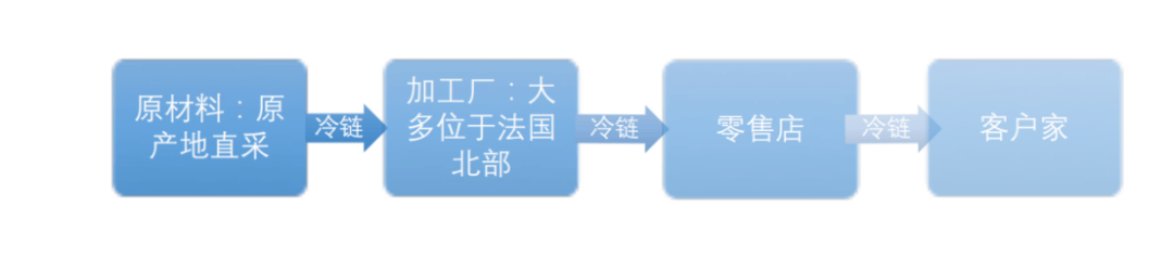 70%以上的食物原材料均是法国本土生产。Picard直切农作物和水产的源头端,和200多家农场的种植养殖户保持着密切的联系,对杀虫剂和化肥的使用量都有严格的把控,而水产品只采购打捞期三天之内的。食物的加工厂全部自建,物流车辆、中转仓、库存管理这几项则采取外包模式。
