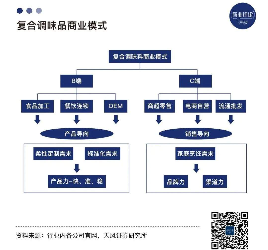 从渠道端来看,复合调味料下游可划分B、C两大类,根据消费群体不同,企业打法也存在差异。