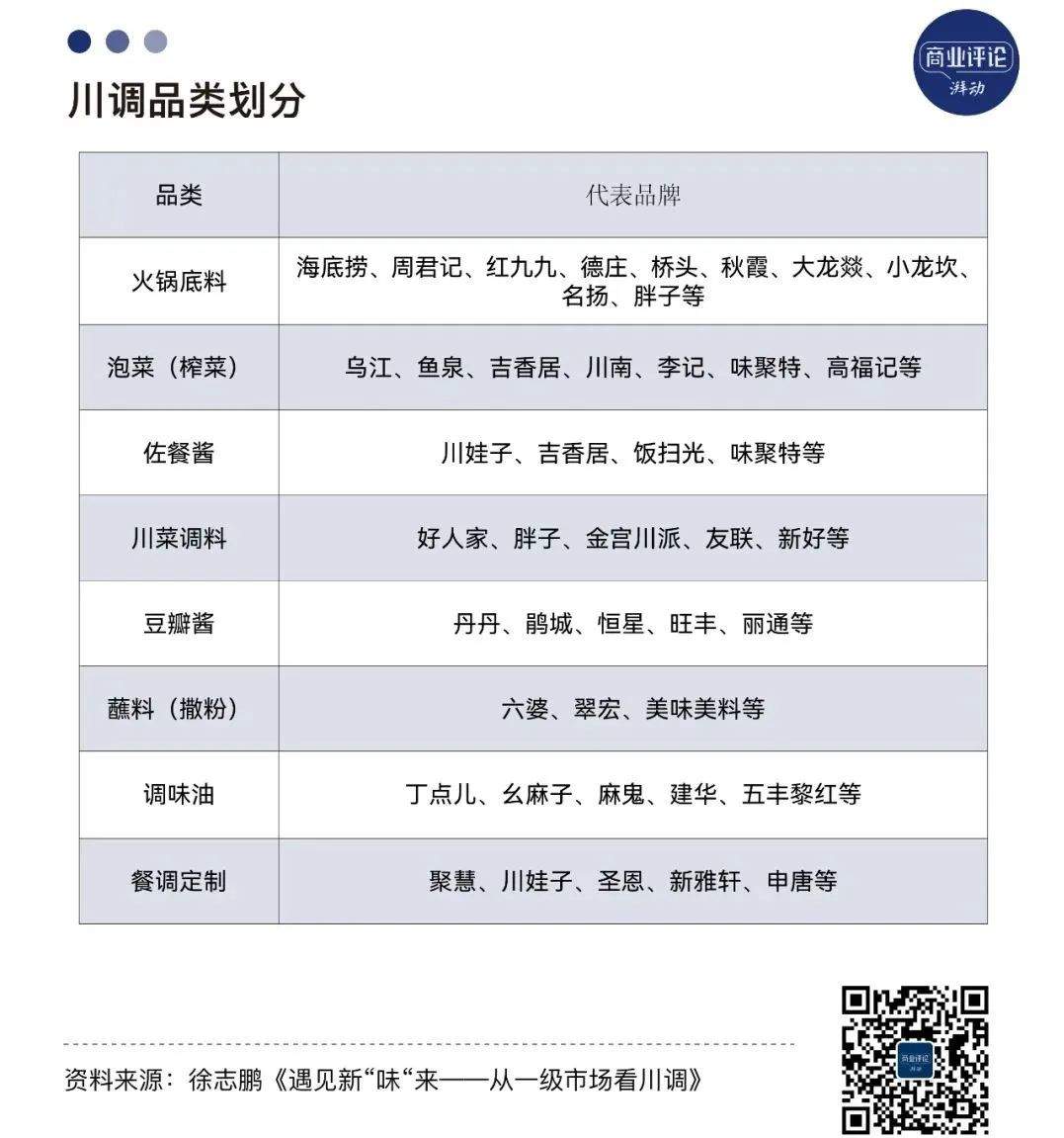 所以,四川调味品以酱料和腌渍菜为主,拥有“麻辣辛香”的独特风味。具体又可分为:火锅底料、泡菜榨菜、佐餐酱、川菜调料、豆瓣酱、蘸料、调味油和餐调定制八个细分品类。