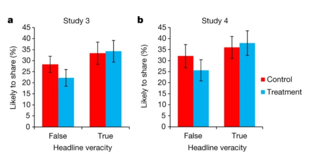 也就是说,当所谓准确性启动效应开启之后,大家转发虚假消息的频率大大减小了——尤其是对那些与个人三观一致的虚假消息,被转发的几率大大降低。这样的干预手段对那些看起来最不靠谱的新闻标题效果最明显。