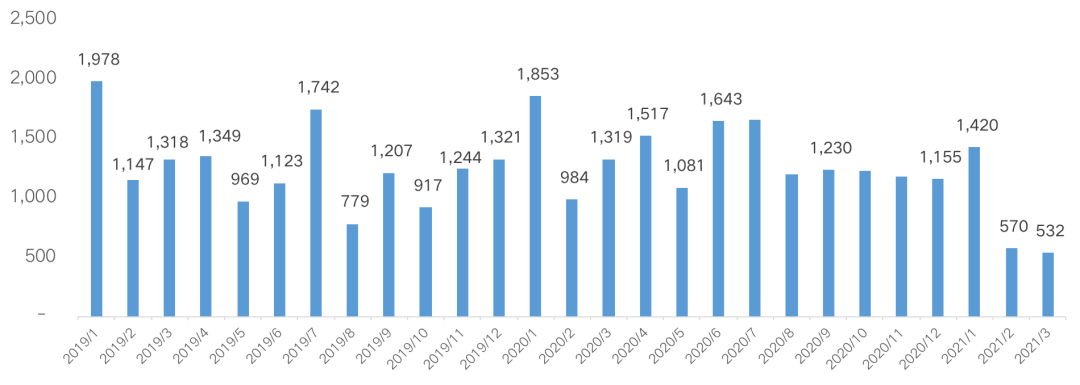 图:2019年-2021年3月房企单月融资额情况(单位:亿元)