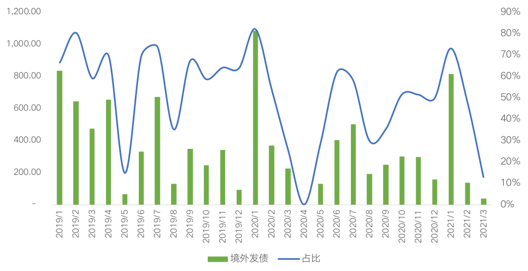图:房企2019年-2021年3月房企境外发债及其占比情况