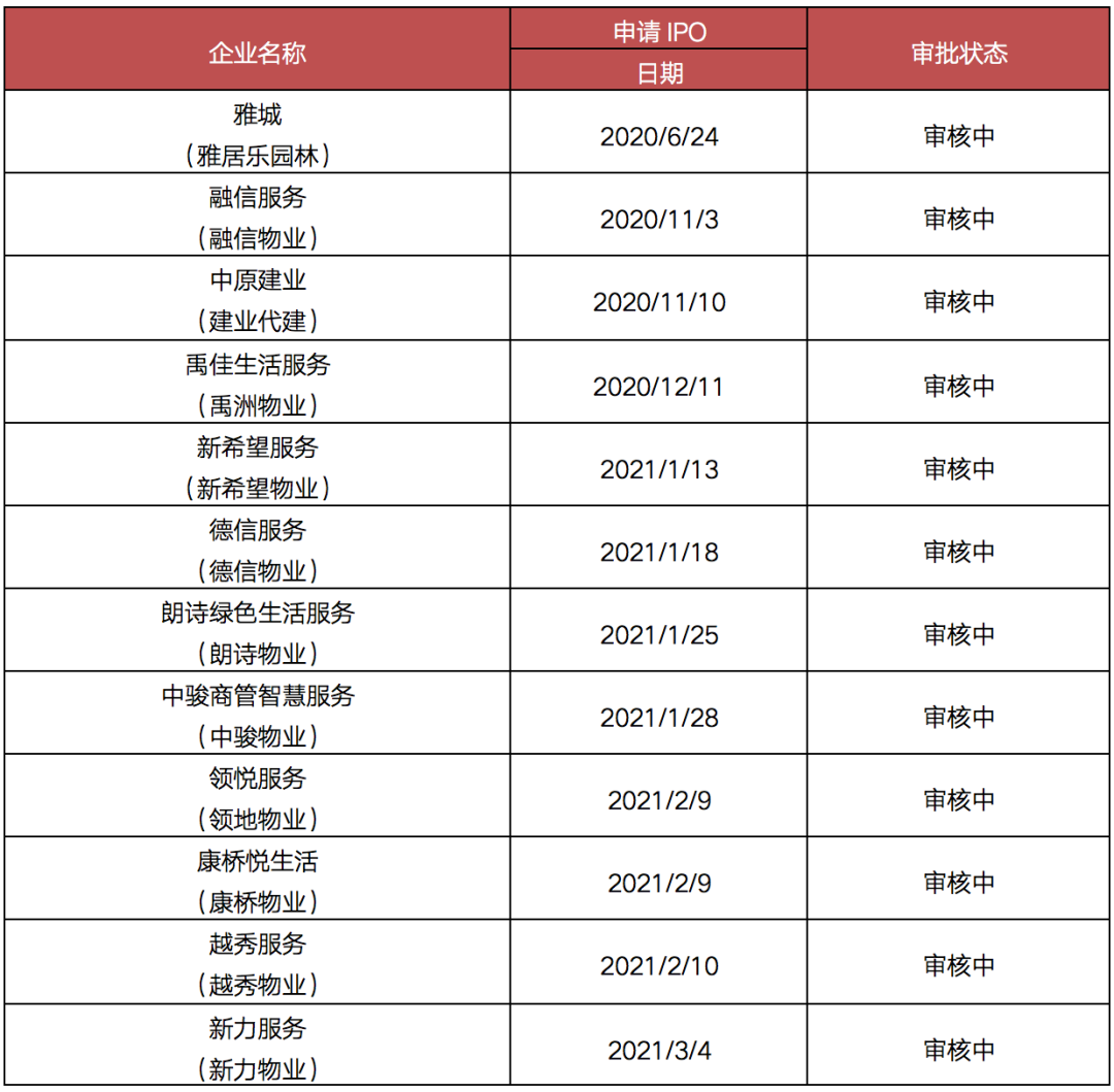 2021年一季度有荣盛、宋都、星河湾旗下的业务公司上市成功,其中星河湾旗下的星盛商业是国内首个纯商业运营服务上市公司。此外,新希望、德信、朗诗、中骏等8家房企分拆物业板块提交上市申请,截止3月26日在港交所递交过招股书而仍未上市的房企旗下公司共有12家。