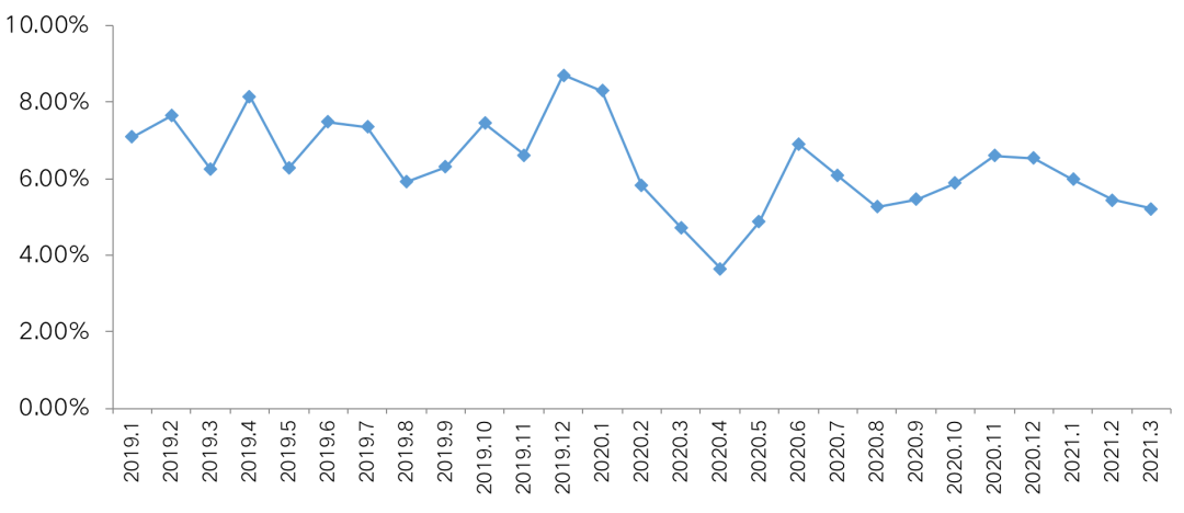 从企业的债券类融资成本来看,2021年前3月的新增债券类融资成本5.76%,较2020年全年下降0.31个百分点,其中境外债券融资成本6.73%,较2020年全年下降1.05个百分点,境内债券融资成本4.40%,较2020年全年微降0.1个百分点。
