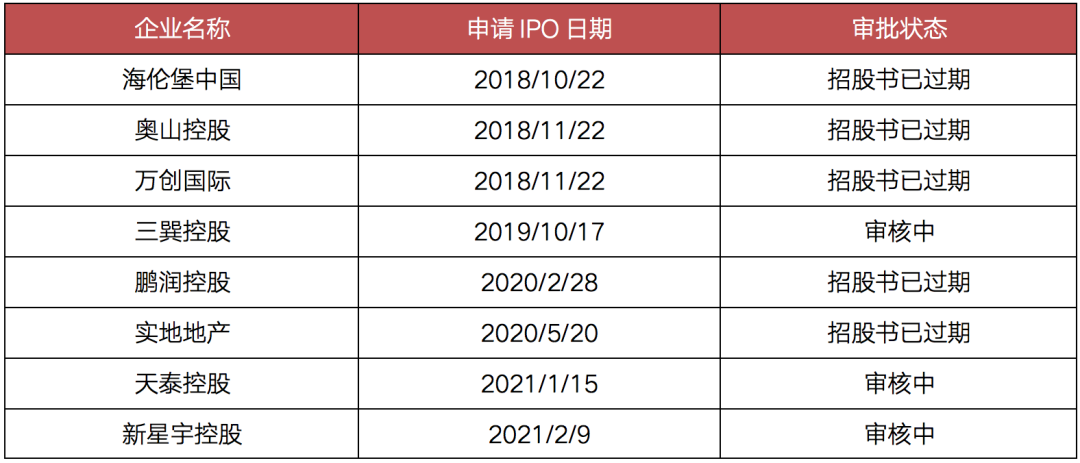 在融资环境持续收紧的背景下,2021年一季度房企对于赴港上市依旧热情不减,新增两家房企递交招股说明书,截至2020年3月26日,在港交所提交过招股书的房企共有8家。
