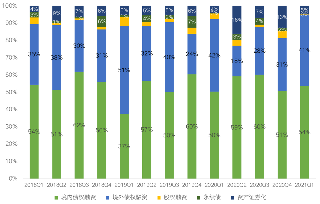 从融资结构来看,境内债权融资占比最大,占比同比上升了4个百分点至54%,环比上升了3个百分点;此外境外债权融资自2020年3季度以来占比就逐步回升,在融资环境收紧的情况下,部分企业积极通过高成本境外债补充资金。