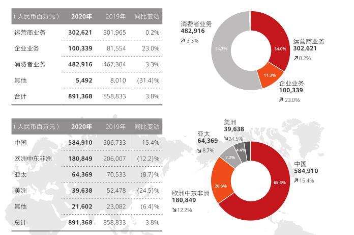按业务划分,运营商业务基本上保持稳定,收入3026亿元,同比增长0.2%,占比达到了34%;企业业务去年的收入增速达到23%,达到1003亿元,占比达到了11.3%;消费者业务中,手机之外其他的可穿戴、平板、PC、大屏等设备,收入去年增长了65%,2020年度整体收入4829亿元,同比增长3.3%,占比达到了54.2%。