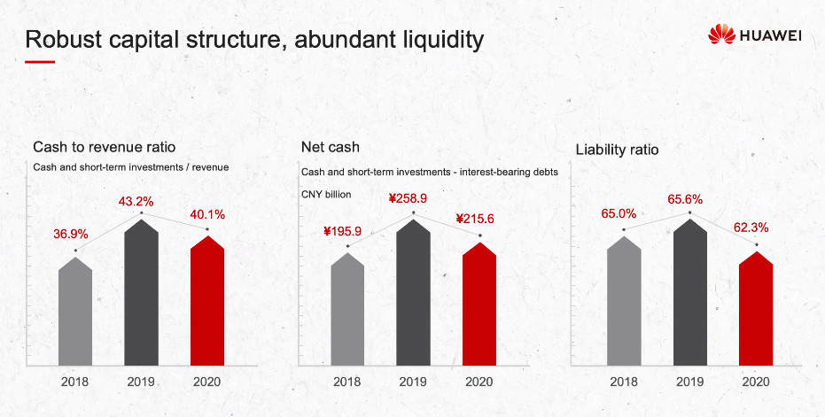 此外,华为现金流为2156亿元,负债率为62.3%。
