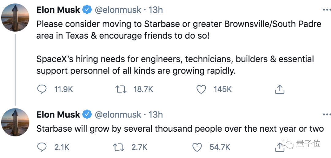 他说SpaceX的人才需求急剧扩张,现在需要工程师、建筑工人、科学家等等人才加入,地点就在Starbase。