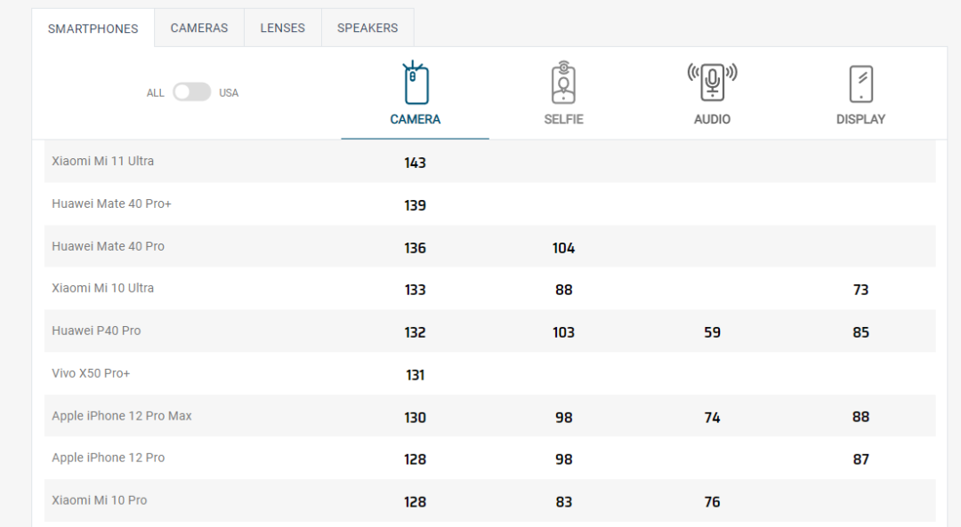 目前从第三方机构DXOMARK的跑分数据来看,小米11 ultra已经跑到了143分,超过了华为高端机型Mate 40 Pro+的139分。