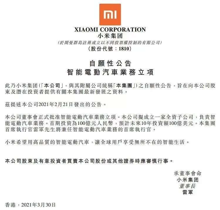 小米造车公告,图源小米官微