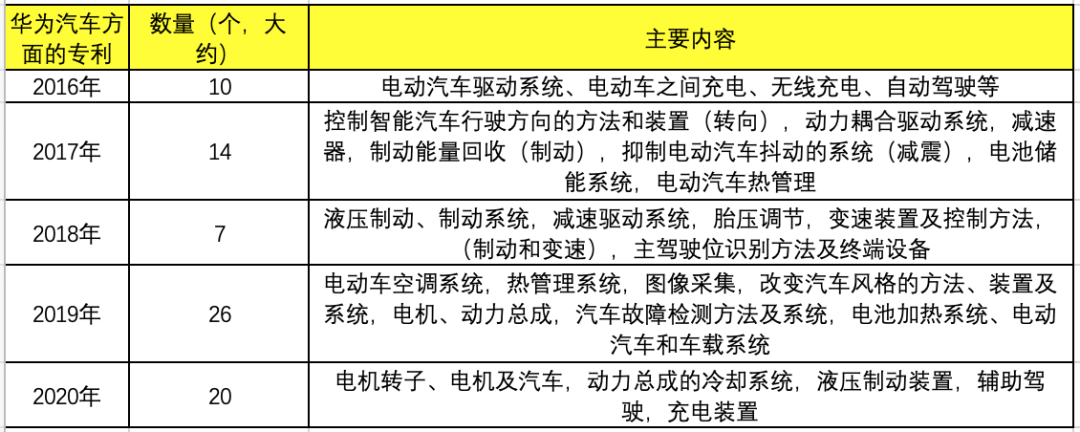 根据国家知识产权局网站上的查询结果统计,华为在汽车领域的专利从2016年开始大规模增加,数量从2016年的10条左右增加到2019年的26条左右,专利内容则集中在电动汽车驱动系统、动力耦合驱动系统,减速器,动力总成及冷却系统、电机转子。此外,在制动、转向、减震、充电、辅助驾驶方面也有很多积累。