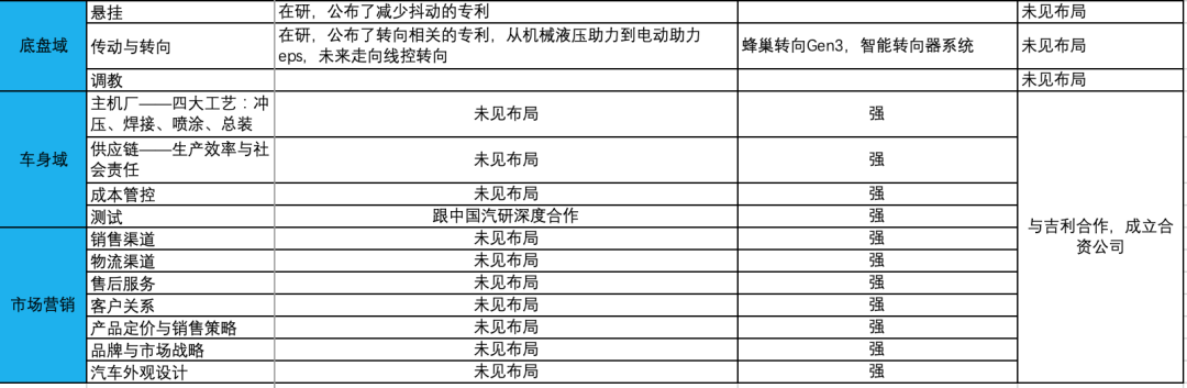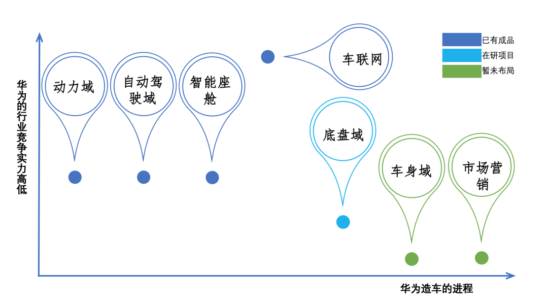 横向对比,华为的各项能力中,车联网水平相对领先,这源于华为在通信行业的多年积累和5G领域的先发优势;在智能驾驶、智能座舱、动力域,华为虽已拥有芯片优势,布局比对手更全面,但面临博世、英伟达、高通等巨头的竞争,某些单项产品的竞争优势并不凸显;在底盘领域,华为在努力研发,但目前水平依然较低;而车身制造和市场营销领域,华为要突破瓶颈。