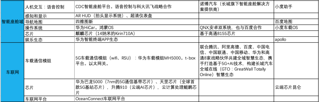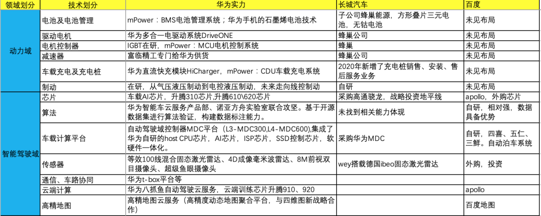 资料来源:华为网站、长城汽车官网、华为公众号、搜狐汽车、世界智能网联汽车大会徐直军演讲、百度世界大会等。