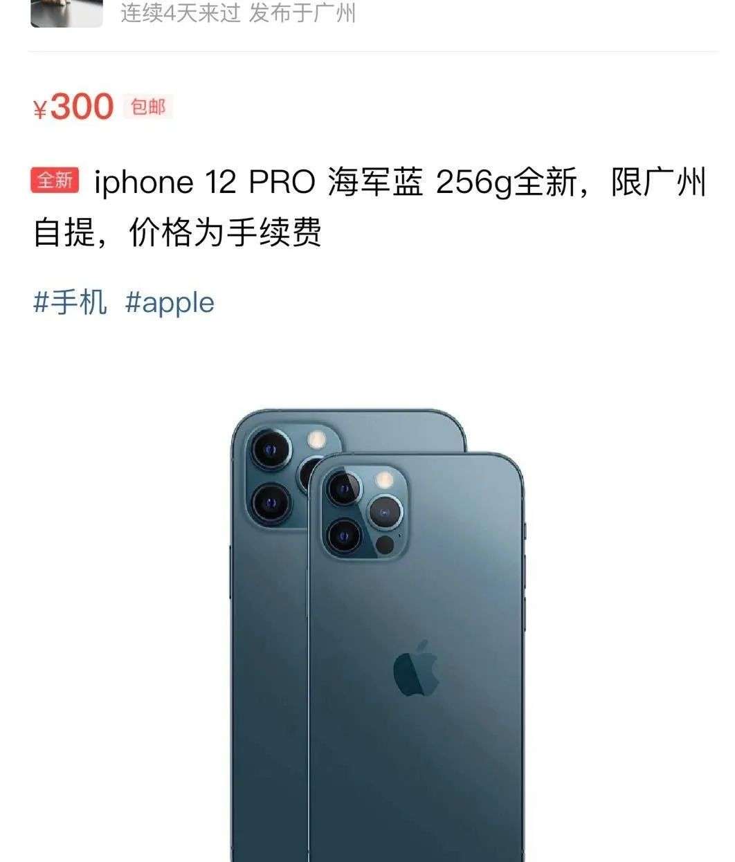 时代周报新媒体记者联系了一家“黄牛”,他表示128G的海蓝色iPhone 12pro首批现货价格为8999,这比官网价格足足多出了500元。记者在闲鱼查证后发现,海蓝色的12pro普遍溢价为300元,但仅限256G版本。一位果粉表示:苹果的黄牛竟然又出来了,我还以为iPhone8之后都改行了。