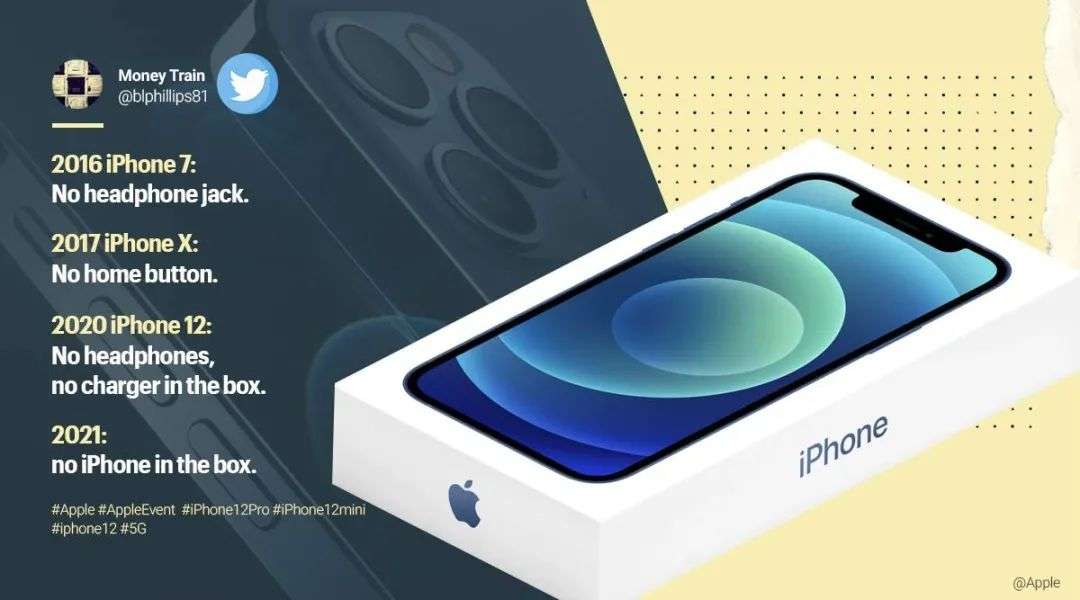 Iphone 移除史:iPhone 7移除耳机孔,X移除home键,12移除耳机和充电头。外媒调侃,2021年,iPhone盒子里就没有iPhone了!