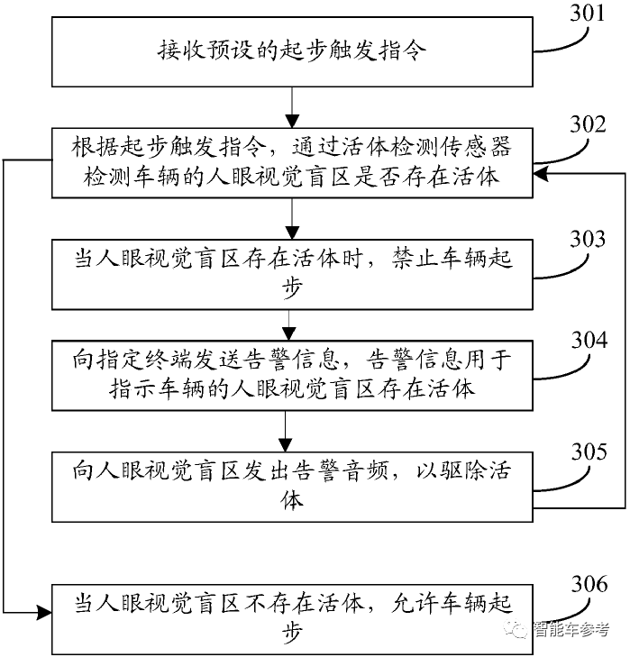 车辆起步控制,在车辆起步前,通过活体检测传感器检测车辆的人眼视觉盲区是否存在活体;当人眼视觉盲区存在活体时,禁止车辆起步;不存在活体时,允许所述车辆起步。