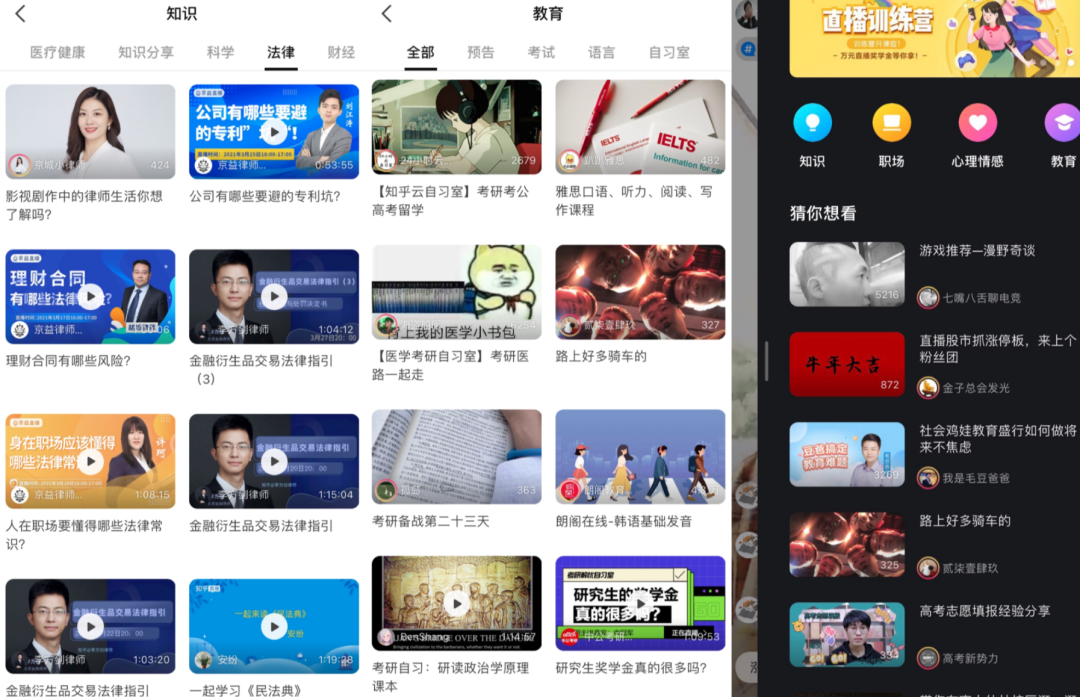 先说知乎,2019年10月知乎直播正式上线,主要分为知识、职场、心理情感和教育四个板块,与知乎的社区一脉相承,知识氛围浓厚。
