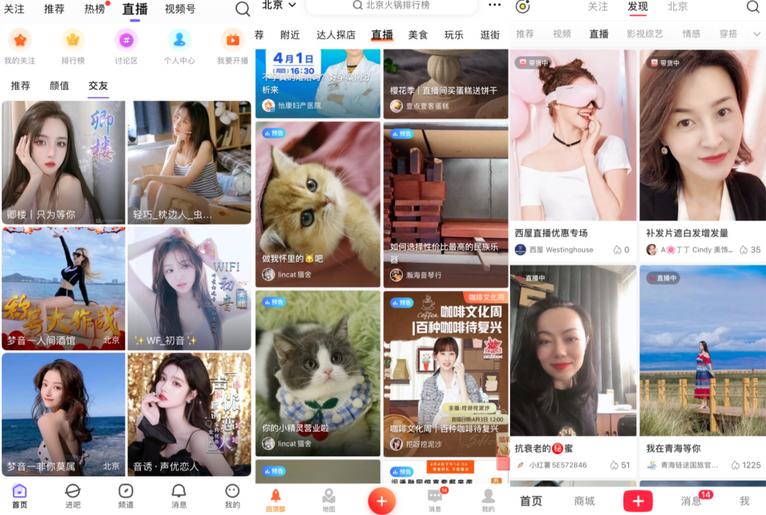 从左到右依次为:百度贴吧、大众点评和小红书的直播界面