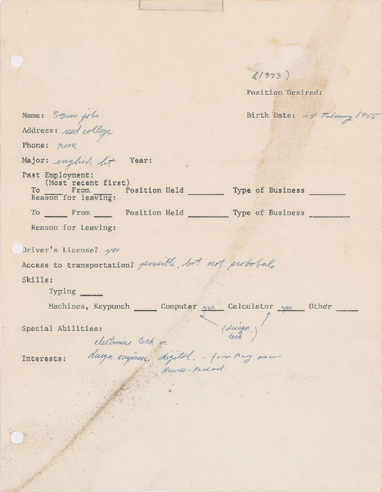 这个申请书是乔布斯从里德学院退学后填写的,当时的他18岁,也经历了所有年轻人都经历的低潮——希望能找到一份工作。