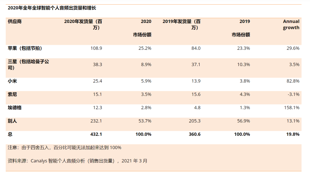 2020年智能个人音频设备增长20%,达到4.32亿台。Canalys研究分析师陈思思(Cynthia Chen)表示:"由于市场进入门槛较低,尤其是TWS设备,成熟的供应链导致设备价格下降,大量出货量在短时间内充斥市场,从传统音频播放器到苹果、三星和小米等智能设备供应商,老牌厂商在 2020 年都获得了强劲的增长”。