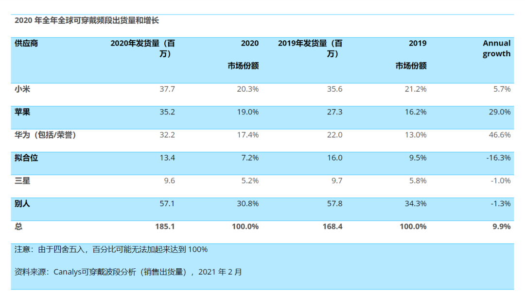 从Canalys的报告上我们还可以看到,在2020年第四季度的全球可穿戴频段出货量上,苹果以25%的市场份额位居第一,同比增长49%。