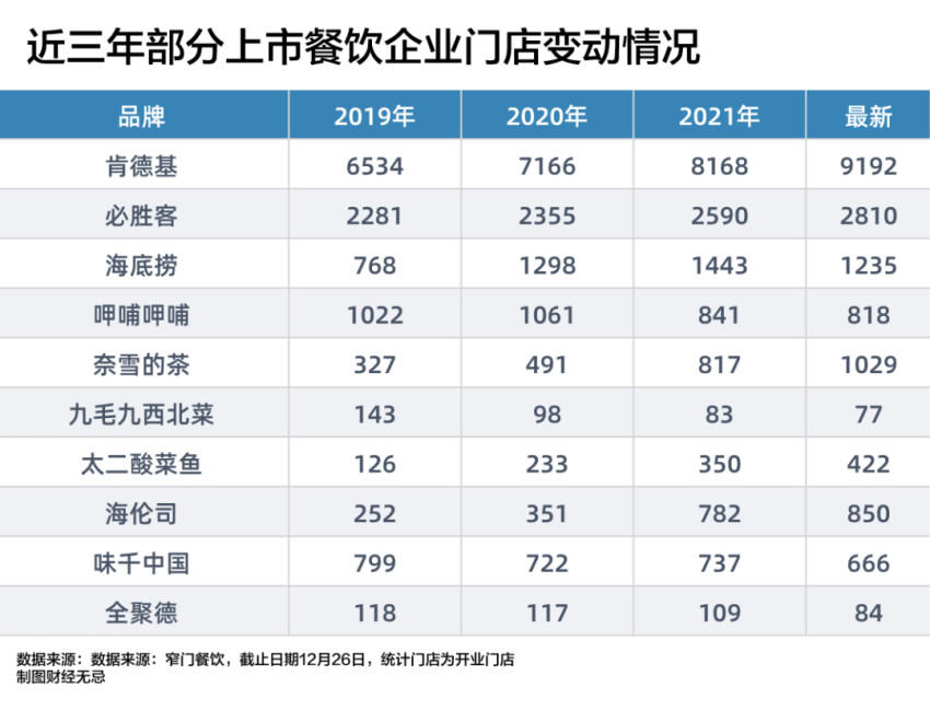 在品类分化外,另一种分化逻辑体现在拓店逻辑上。梳理近三年来上市餐饮企业的门店变动情况,头部餐饮企业对门店的扩张显得越来越谨慎,避免再次出现类如海底捞一样的“逆势开店”悖论。