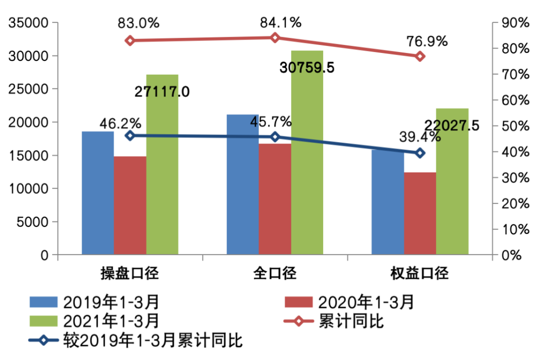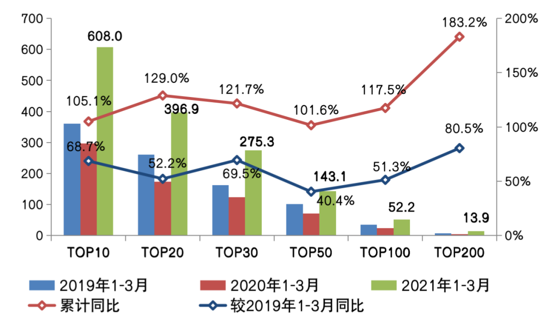 从1-3月的累计销售操盘金额来看,百强房企整体的业绩规模同比增长83.0%,较2019年同期增长46.2%。