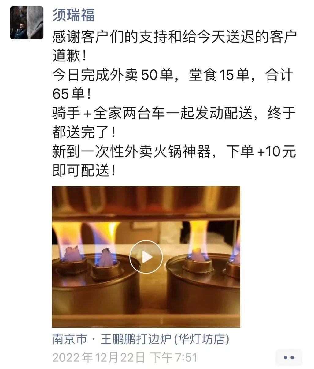 我联系到王鹏鹏打边炉的老板@须瑞福,即便12月中旬,南京最紧张的时候,外卖没人送、员工全中招的情况下,他还一直选择坚持营业。