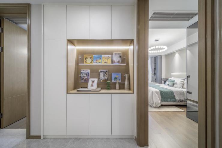 而B户型(建筑面积约98㎡),关注户型收纳空间,在走廊预留安装整面墙体的过道柜空间,让储藏空间翻倍;在房间结合飘窗特点,预留梳妆柜设计空间;在玄关位置,预留安装可延伸至走廊储物柜空间,最大化利用空间。